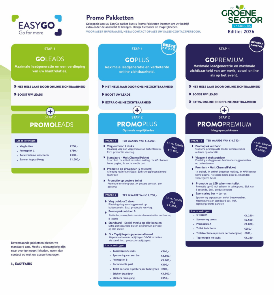 Gekoppeld aan jouw EasyGo-pakket kun je extra promopakketten inzetten om jouw bedrijf nog beter onder de aandacht te brengen. Vergroot je bereik en ontvang de juiste bezoekers op je stand. Bekijk hieronder de mogelijkheden voor Evenementenhallen Hardenberg. Meer weten? Neem contact op, we denken graag mee.