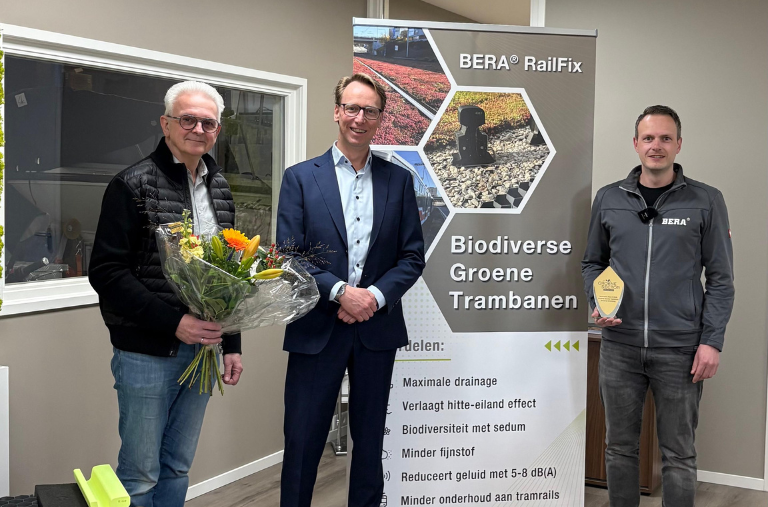 In de categorie Groene Inrichting won BERA met RailFix, een innovatieve oplossing voor het vergroenen van trambanen in stedelijke omgevingen. Het systeem draagt bij aan geluidsreductie, verkoeling, biodiversiteit en regenwaterinfiltratie. Met RailFix maakt BERA het eenvoudig toepasbaar om steden groener, gezonder en toekomstbestendig in te richten.